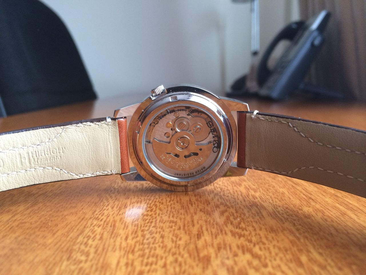 透けるトンだ!SEIKO 5はクオーツ製の偽物が大量に出回ったため、裏を透け透けにして判別が付くようにした、らしいです。