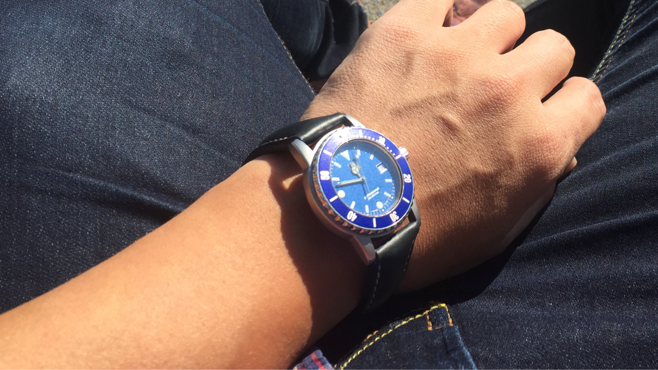 使用したベルトは、CASISのブライトリングDバックル専用の紺色のもの。なかなか高級感ある。白ステッチもカッコ良い。