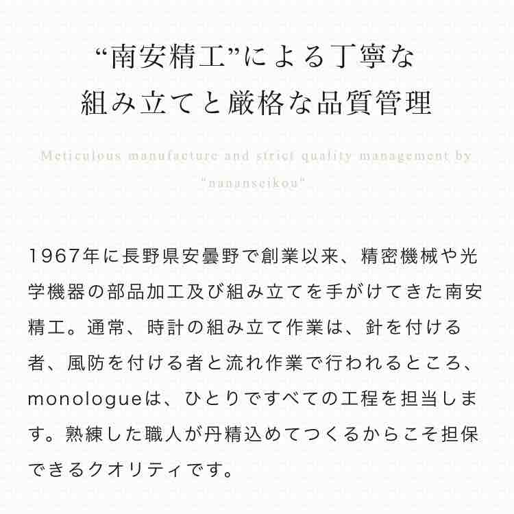 そもそもモノローグとは。1967年に長野県で創業した機械の部品加工会社が始めた腕時計ブランドだと。日本製のムーブメントを載せて、デザイン・設計・ケースの製造と腕時計組み立ては自社で行うみたい。