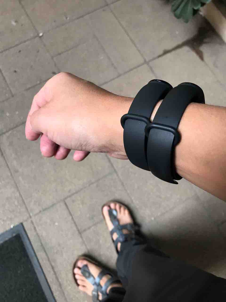 片腕に2本のmibandを装着するとグラディエーターみたいになる。その検証のため、僕の手持ちの中で最もグラディエーターっぽいサンダルを履いてみました。