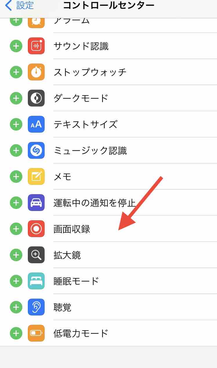 ・下の方の「画面収録」。この左にある緑の丸に+マークをタップ。