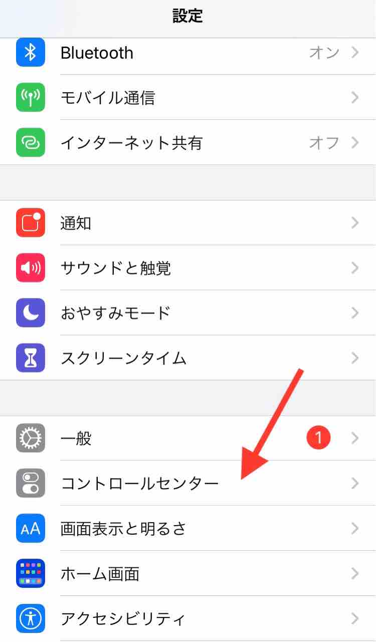 ・iPhoneの「設定」→「コントロールセンター」。