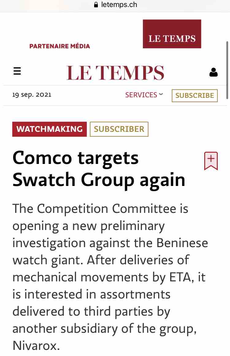 ところで、ネットで検索していると、わりと最近のニュースでは以下もヒットしました。記事全文は読めなかったんですけど、COMCOがスウォッチの傘下二ヴァロックスの調査に入ったのだそう。これ、ETAムーブメント供給停止の二の矢としてスウォッチグループが打ち出した、ひげぜんまいの供給制限を指していると理解します。なんでいまさらこのニュースなんだろ。