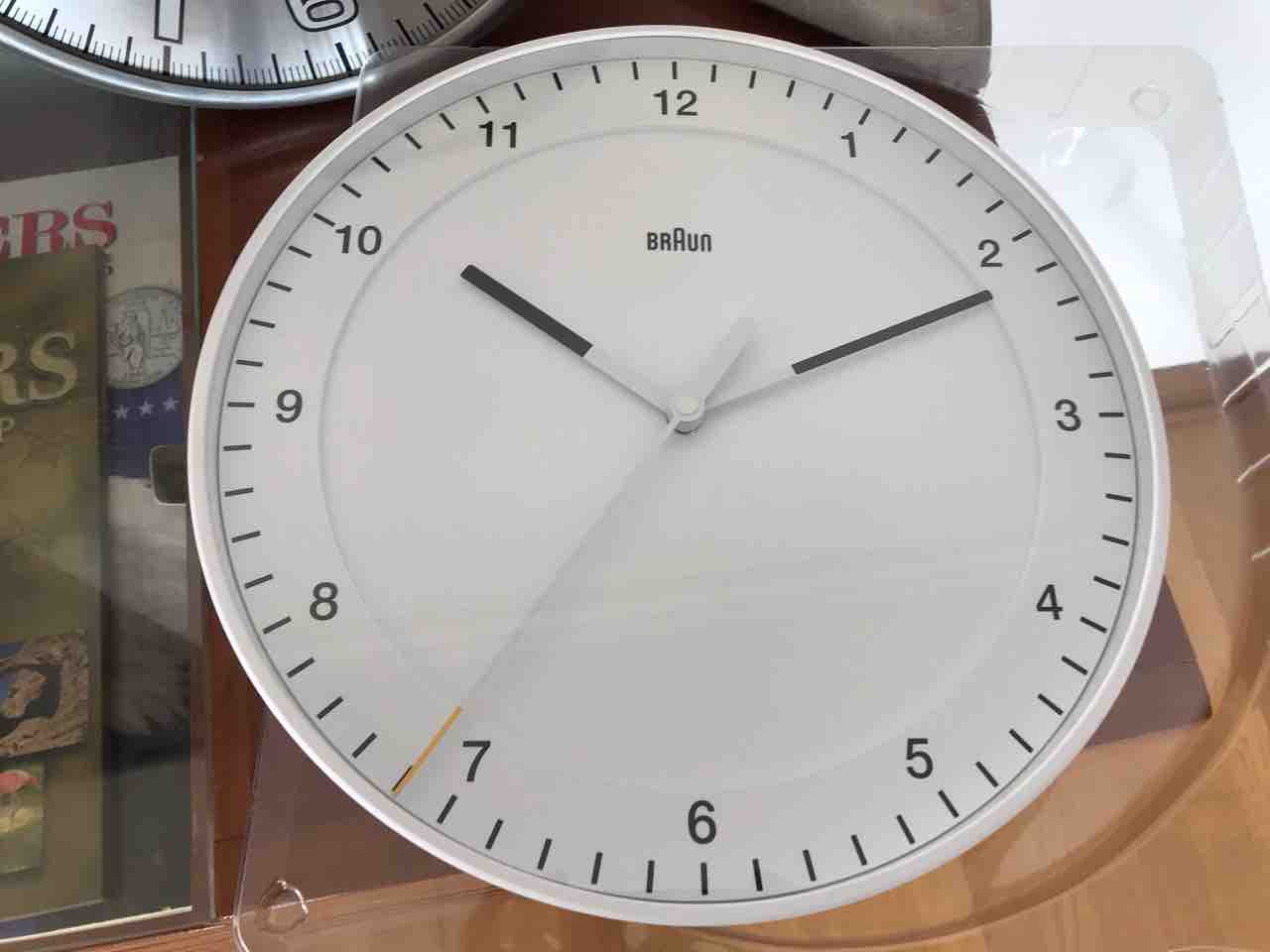 秒針の先っちょが黄色いのがポイントなのでしょう。おしゃれ。秒針はスイープ運針ですが、驚くほど静かです。我が家のリビングがシーンとしとる。さすがBRAUN。