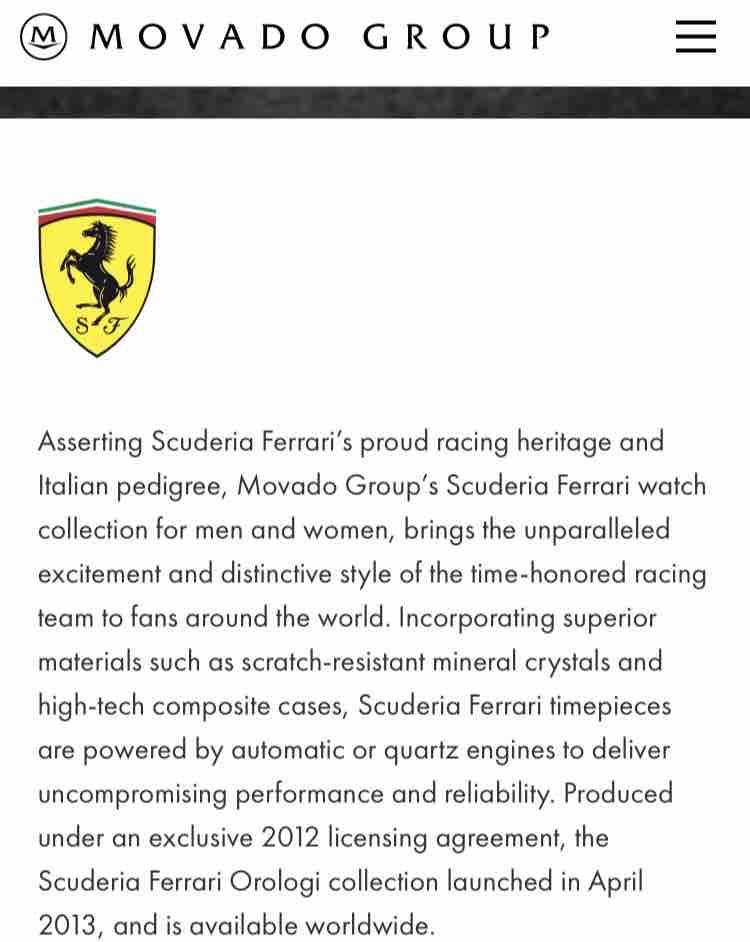 要するに、ライセンス商品なんです。つまり使用料を対価に、スクーデリア・フェラーリのロゴの付いた腕時計を企画・製造・販売する権利をMOVADOが得ている。昔の三陽商会バーバリーや、株式会社ドウシシャのハンティングワールド腕時計と同様。