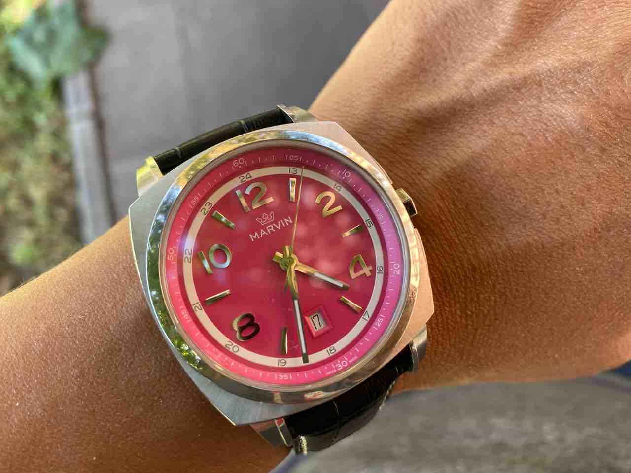 なかなかビビッドなピンクを取り上げておられる。。あれれ、忘れてるよ!ピンクの腕時計といえばコレ、マーヴィンさんのマルトン160クオーツを忘れてるよ!↓