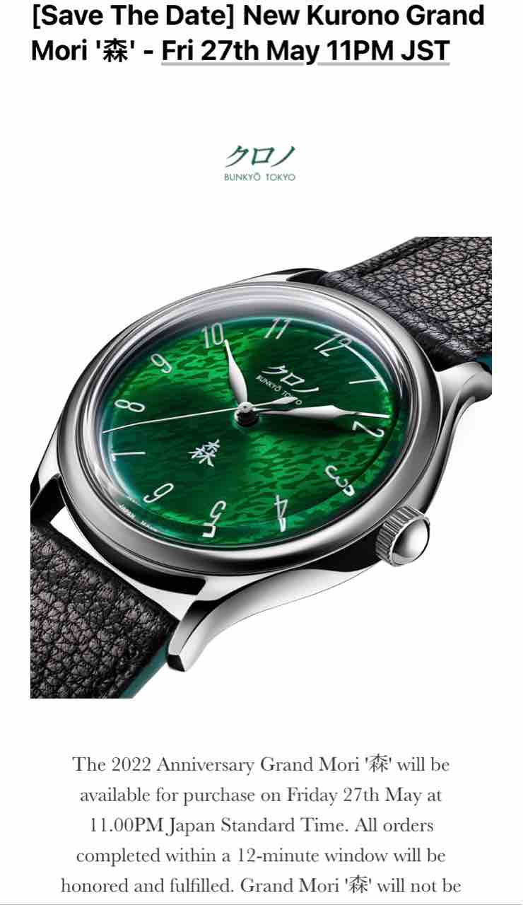 今日はトレーサー 2022年05月27日 クロノトウキョウの「グランド森」注文受付、いよいよ明日ですね。というか日本時間だと今夜ですか。この機会を逃したらもう販売しませんよ、とメールが来ました。ぐむむ。グリーンに加えて漆ですもんね。文字盤の色味めちゃいいなあという気持ちと、片仮名クロノってどうなの、漢字で森ってどうなの、という気持ちが交錯して僕はもうよくわからなくなってきました。あと10時間くらいで決めないといけない。うむむむむ。でももっと好みドンピシャなモデルが出てくる可能性もあるんだよね。漢字だったら森より朱鷺の方がカッコよかったしなあー。画数多かったし。今日はトレーサー にほんブログ村時計ランキング < 前の記事次の記事 > コメント コメントフォーム 名前 コメント 評価する リセット リセット 顔 星 投稿する 情報を記憶