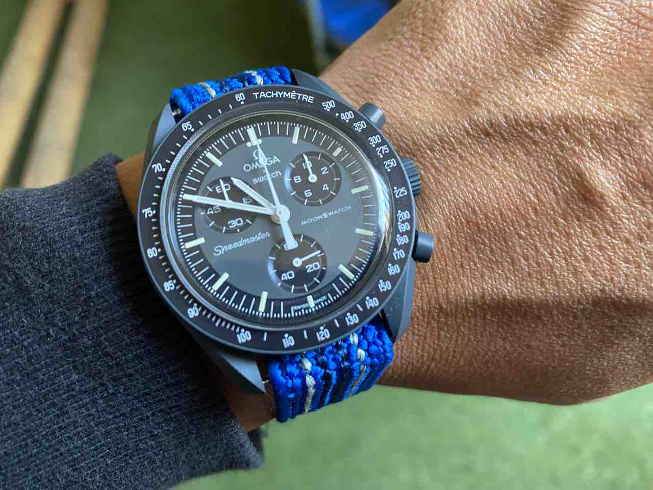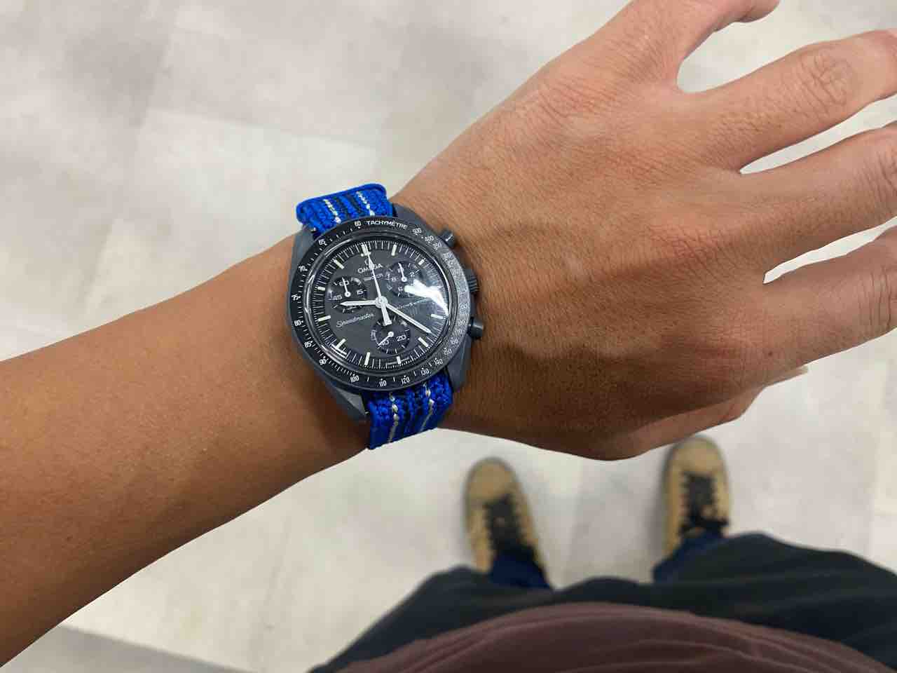 いけないけない。限定モデルに心惑わされることなく、僕らは大人しく自分のムーンスウォッチをヨシヨシ愛でようじゃないですか。ということで、ベルトを変えてみました。腕時計界のほとりに位置する本ブログくらいには穏やかな風が吹くようにと城のオババが祈りを込めて織った明るいブルーの組み紐ストラップ。嘘です、knotのやつです。