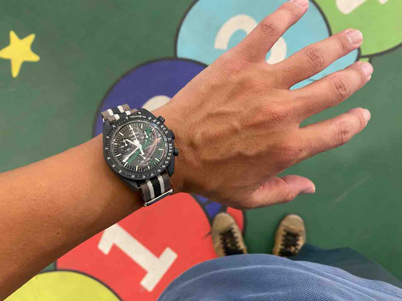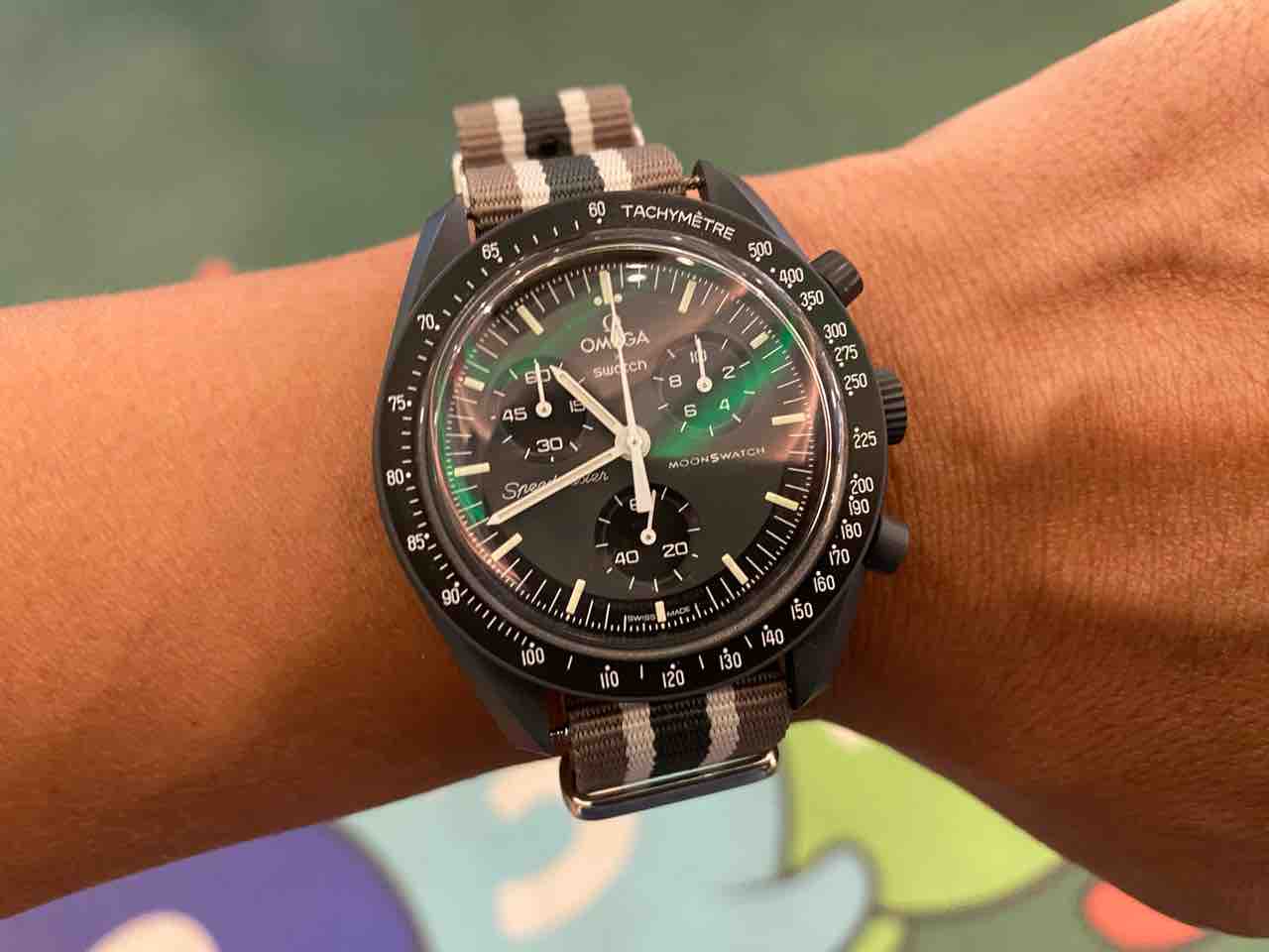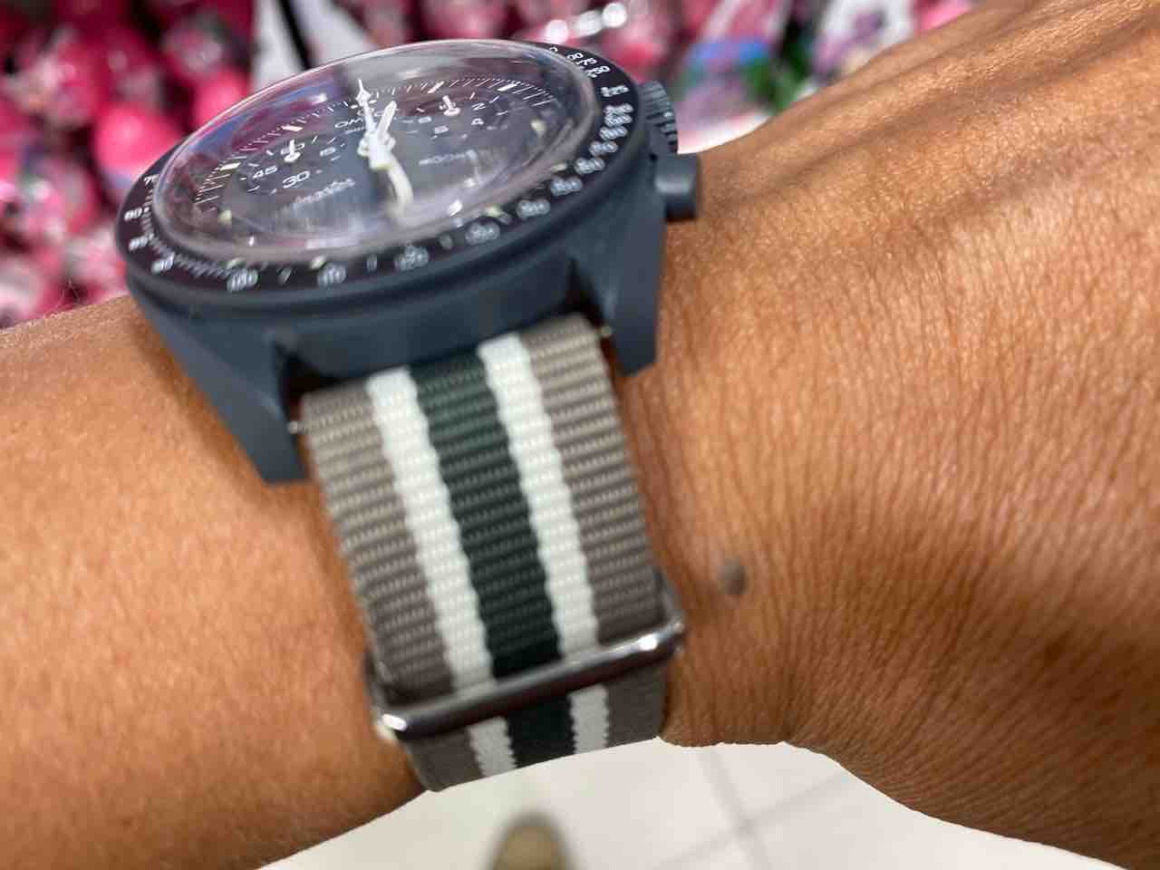 そんなこんなで自然と着用頻度が高くなってます、ムーンスウォッチ。今日は007スペクターのストラップをイメージして。