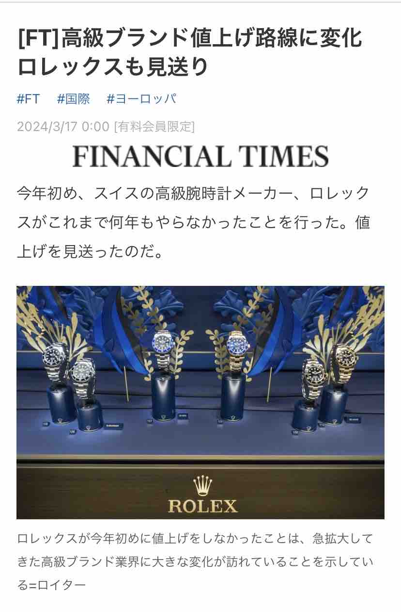 [FT]高級ブランド値上げ路線に変化 ロレックスも見送り:日本経済新聞https://www.nikkei.com/article/DGXZQOCD133110T10C24A3000000/