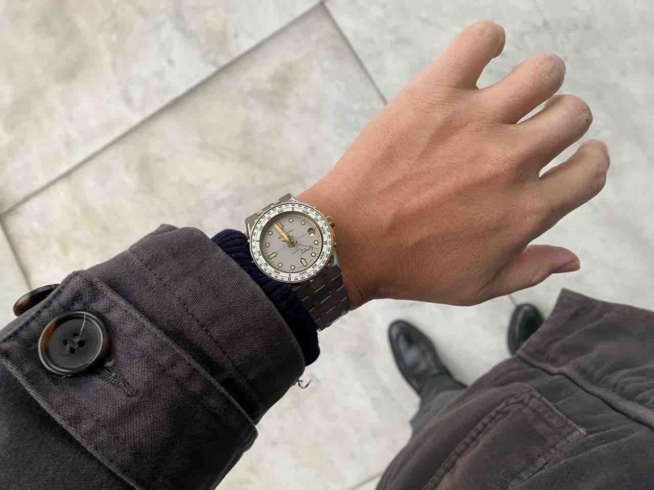 冬場は古いクオーツはムーブメントの油が固まって動かなくなるのでやさしく温めてあげてください、というのを昔どこかで読んだことがあり、その教えを愚直に守り続けています。これも小鳥を抱くように手の平でふんわり握りしめていたら遅れも特になく動くんですが、腕に載せただけだとずるずる遅れてしまう。オーバーホールに出せってことなんでしょうな。