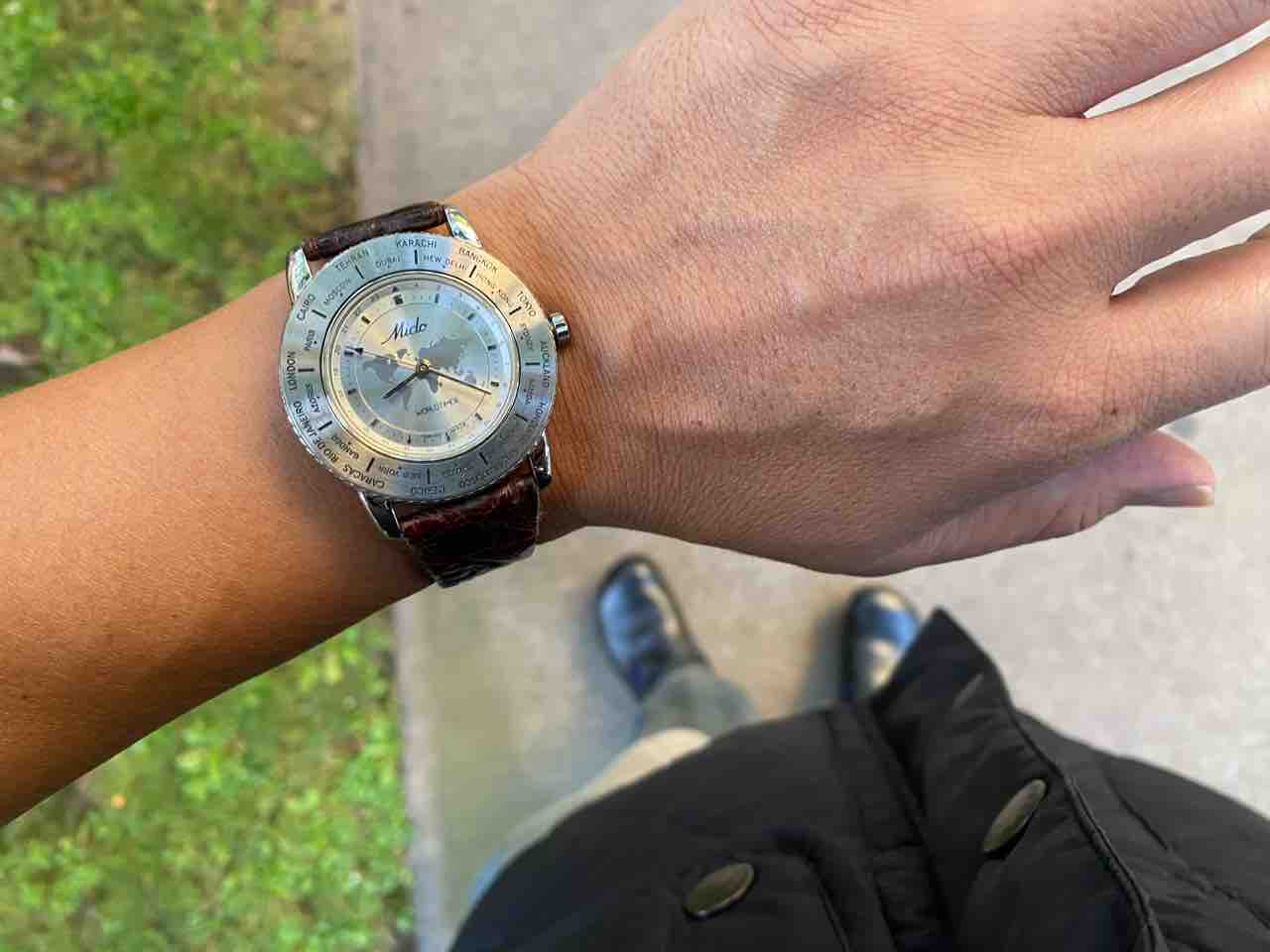 ヤフオク!で見かけましたが、1980年代ミドーの名品・ワールドタイマーに黒文字盤があるんですね。世界地図がブルーでかっこいい。そして金属ブレスは純正なのかな。ガタつきありそうだけど、ミドーのロゴ入ってるし。これはいいな。いいな!
