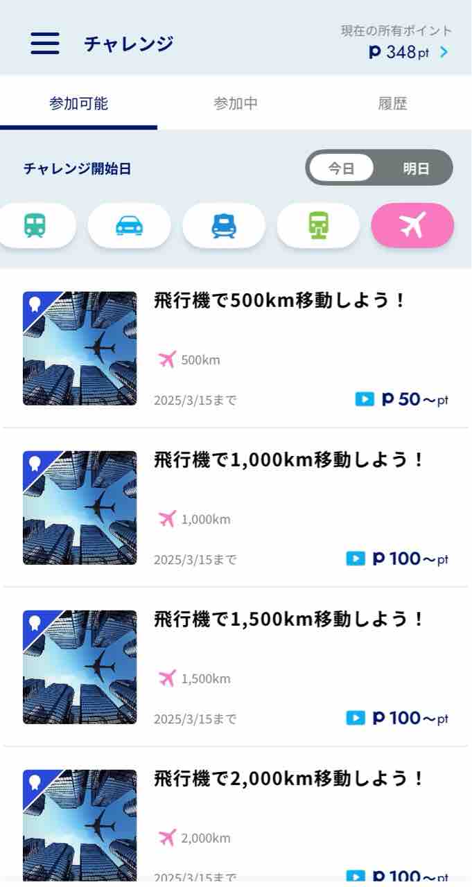 チャレンジと称して、手段問わず1日で50km移動すると100ポイント、飛行機で500km移動すると50ポイント、みたいなのもある。旅行に出発する前にチャレンジを始めておくのが最近の嗜みのようです。