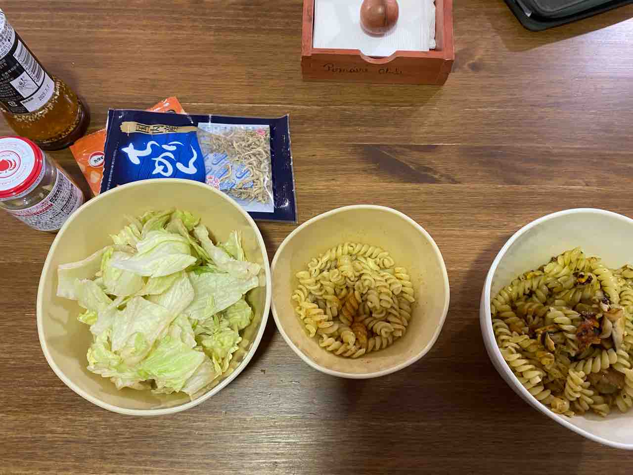 パスタ。レトルトソースが残っていなくて適当にオリーブオイルとニンニクと唐辛子をかけました。素材の味がしていた。