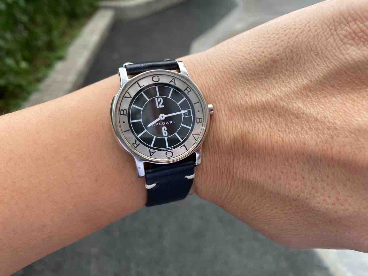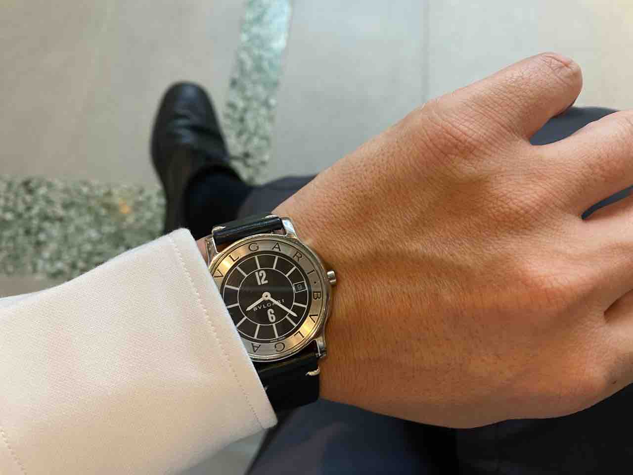 今日はブルガリのソロテンポ。これも海外駐在中に電池切れしていたもの。電池交換に出したところ、中身の機械が弱っているのでオーバーホールを勧められました。オーバーホール代は電池交換含めて1.9万円なり。ぐううー。3万円台で買った時計に約2万円。。でもまあ、ブルガリだし。。